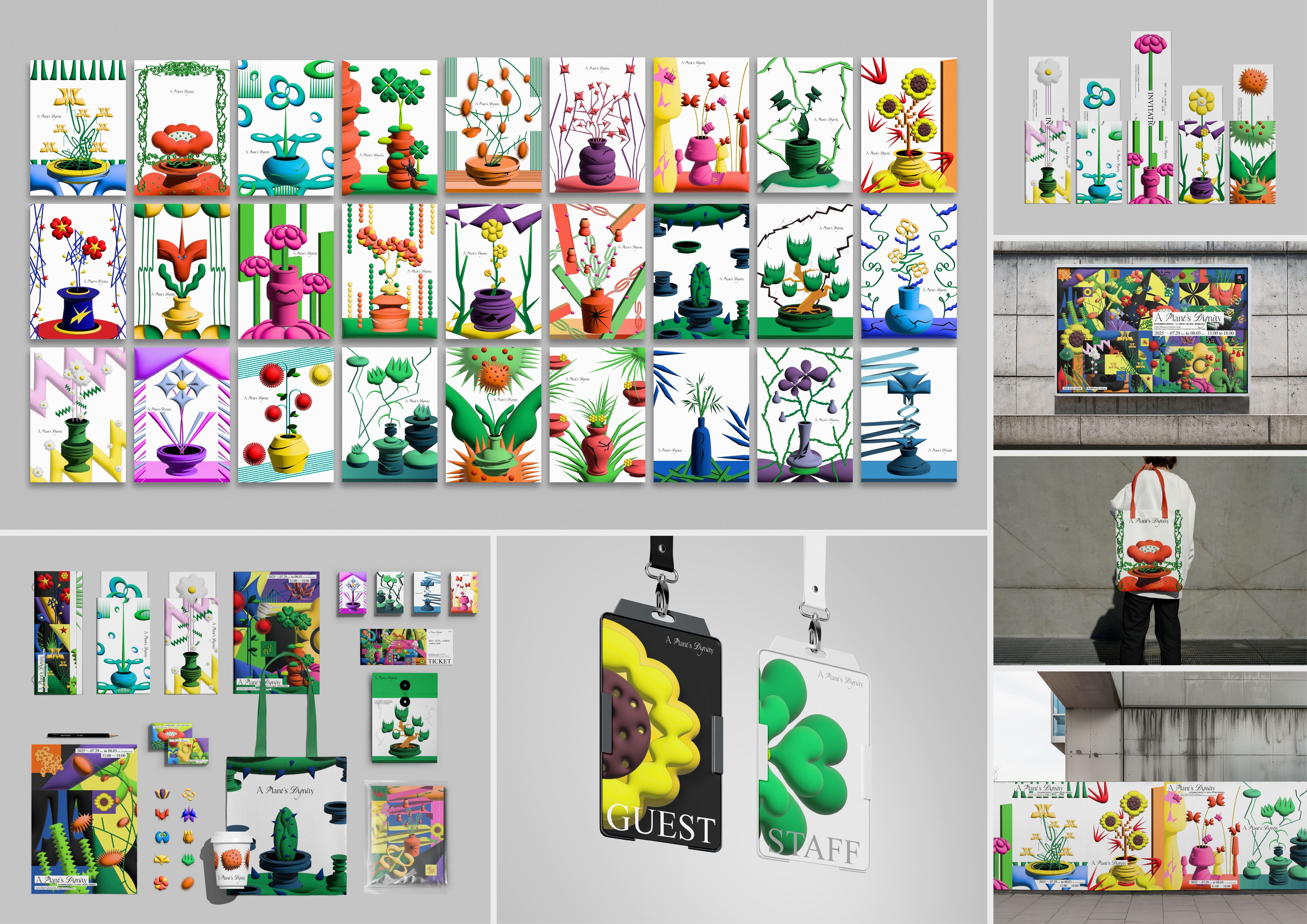 展覽《A Plant’s Dignity》為創作者的碩士畢業個展,主題為──批判思維應用於策展設計:「以人類與非人類之關係——植物權為例」,其所探討的核心問題為:「植物是否應該與其他動物一樣,享有應有的尊嚴與權益?」展覽主視覺圍繞此議題展開,從批判思維的角度出發,展現出一種鮮明的「態度」——透過帶有挑釁與諷刺意味的視覺語彙,刻意營造衝突與不適感,從而更精準地回應主題核心。亦藉由植物的圖像、形態與符號語彙,建構出一個以植物為主體的未來異托邦,象徵真實與虛構之間的曖昧邊界。此異托邦不僅作為觀者進入展覽的橋樑,也成為引發其與展品之間共鳴的媒介,進而引導觀者重新審視植物於倫理與關係中的位置。