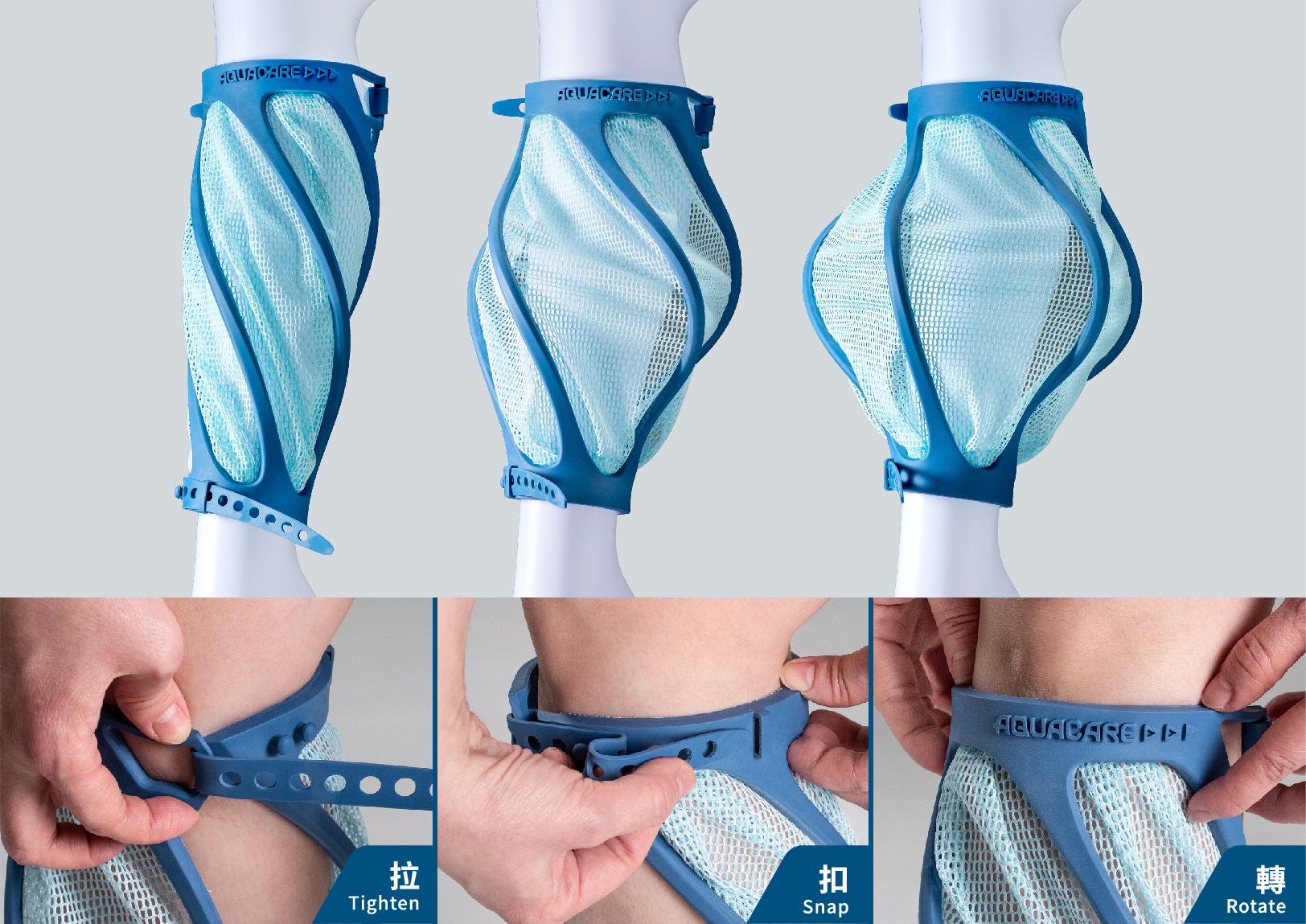 隨著年齡增長,長者下肢肌力逐年退化,研究指出70歲後每十年流失15%肌力,進而提升跌倒風險,影響其獨立生活能力。然而陸上運動易造成關節壓力、水中訓練則缺乏合適器材,現有裝置多以浮力或負重為主,不僅容易翻覆,亦使上下岸困難、不利自主訓練。我們設計出以水阻為核心的Aquacare,一體式裝置僅需三步驟即可穿戴,旋轉調整膨起程度以改變阻力,同時運動速度越快或是膨起程度越大、阻力值就越大,讓長者能依自身狀況調節訓練強度,以此來達到更安全、有效率的訓練。
