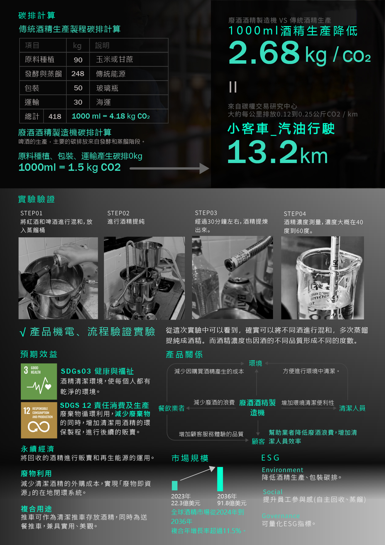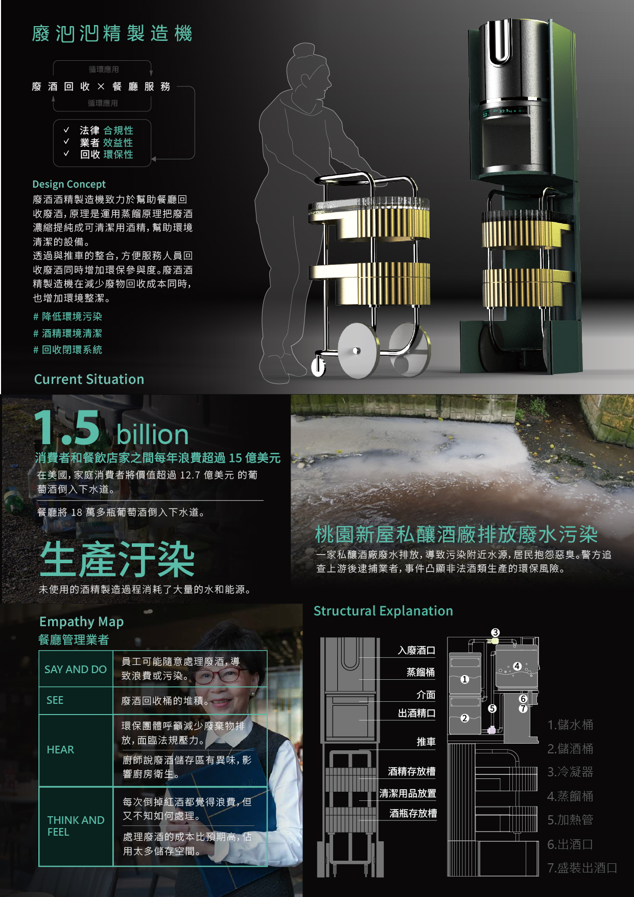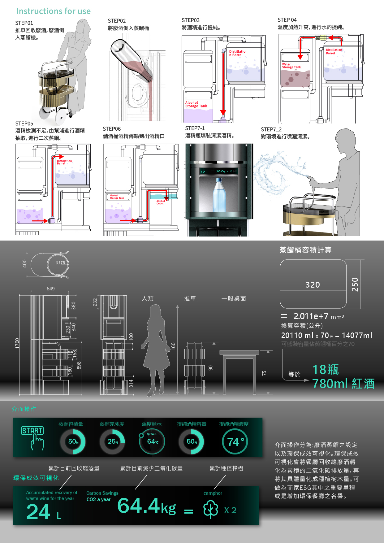 廢酒酒精製造機致力於幫助餐廳回收廢酒,原理是運用蒸餾原理把廢酒濃縮提純成可清潔用酒精,幫助環境清潔的設備。