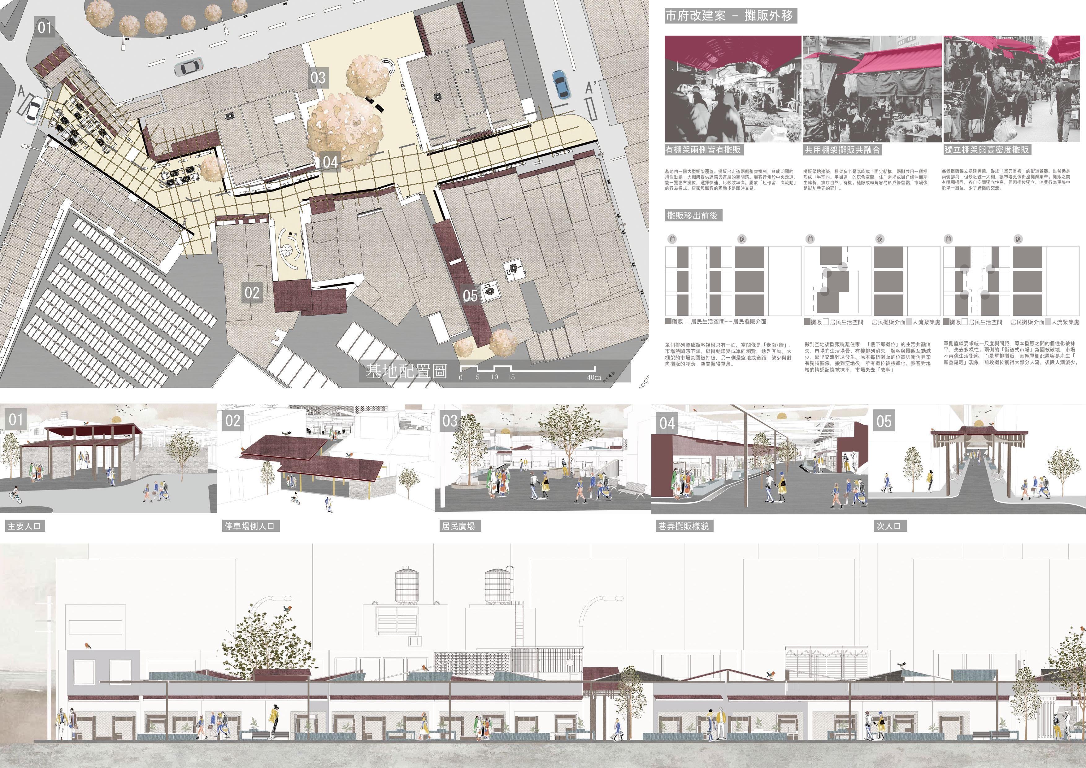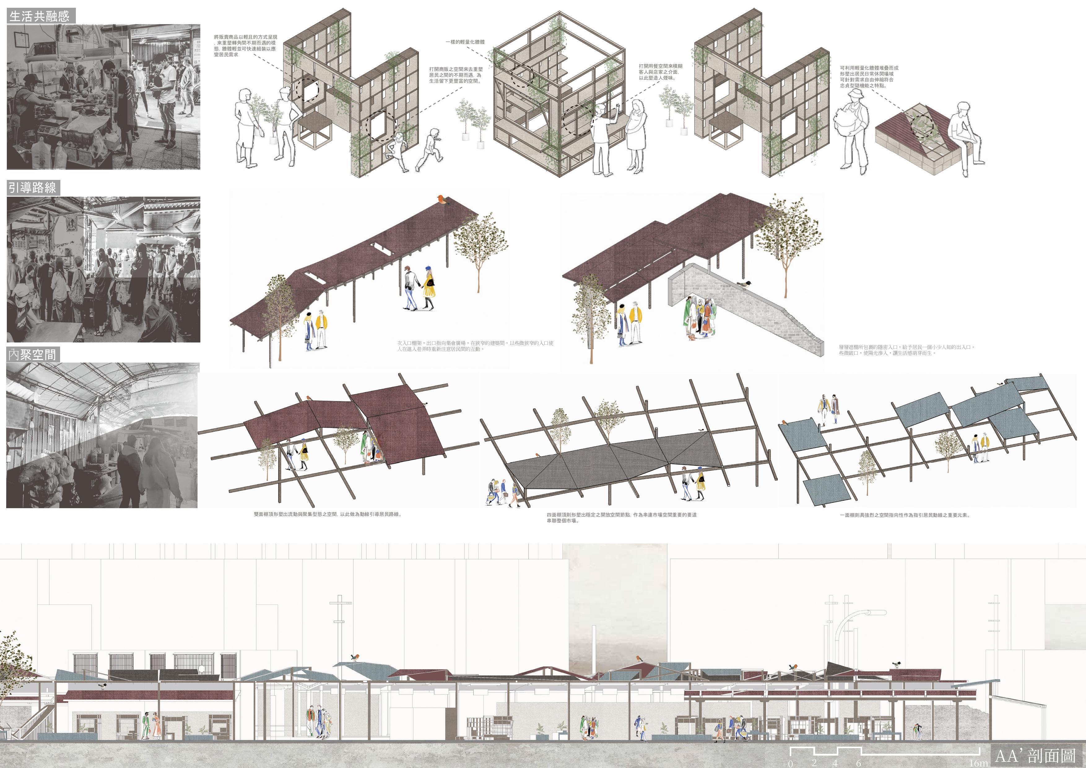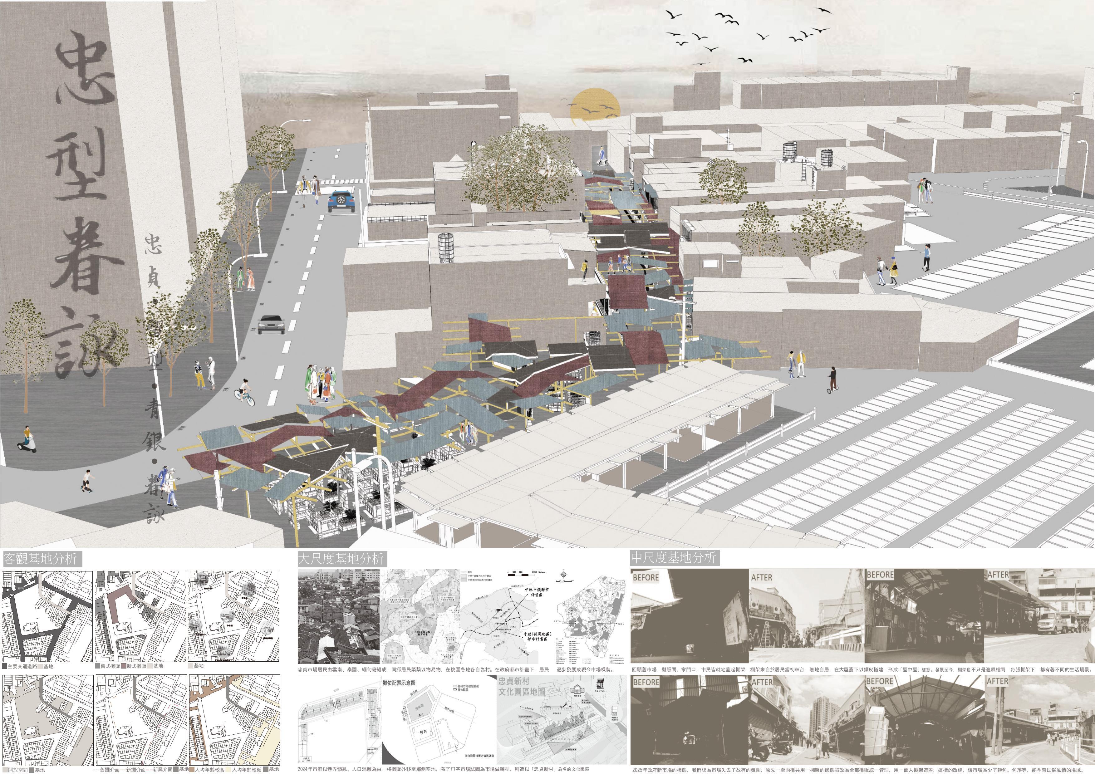 忠貞市場不僅是交易買賣之所,更是眷村移民歷史的縮影。早期自滇緬輾轉而來的移民,因戰亂漂泊,終於在此安身,市場遂成為他們尋覓歸屬的所在。然而隨著時代推移,國族認同逐漸式微,原本以「忠貞」為核心的精神象徵,亦與當代生活經驗產生落差。近年改建雖改善硬體,卻多停留於懷舊展示與國族標誌,忽略了居民在認同、歸屬與社群連結上的真切需求。本設計以「根繫異域,情歸忠貞」為核心精神,嘗試透過忠貞既有之元素轉譯為棚架、入口設計、攤販形式回應不同的市場空間記憶。以一面棚延續「樓下即市」的日常;以兩面棚再現市廊秩序;以四面棚於節點聚場。市場由此不僅承載「他鄉記憶」,更生成「此地歸屬」,成為跨世代共享的「家之所在」。