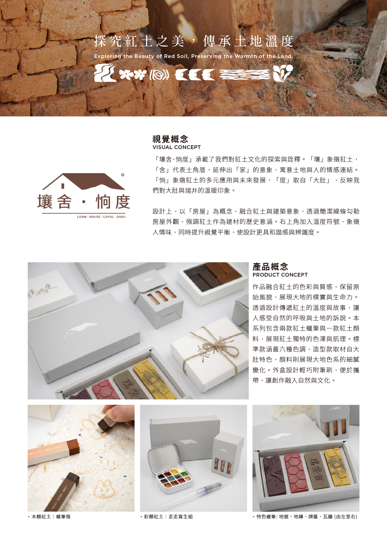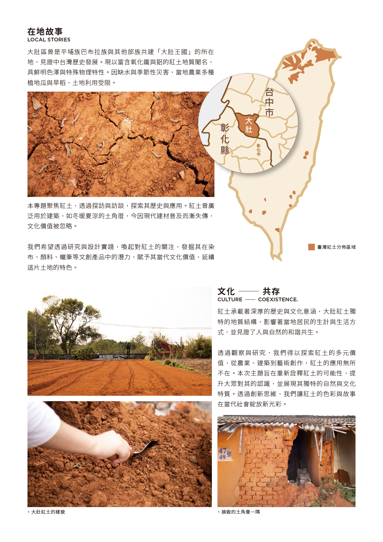 大肚區為平埔族巴布拉族與其他部族建立的「大肚王國」所在地,歷史文化深厚。當地紅土地質富含氧化鐵與鋁,色澤鮮明,具特殊性,卻因缺水與季節災害限制農業發展,多種植地瓜、花生與旱稻等耐旱作物。本專題聚焦紅土,透過田調、資料整理與訪談,探討其歷史與應用價值。紅土昔日常用於建築,如紅土土角厝,具冬暖夏涼之效,惜因現代建材普及而式微,傳統技藝也漸失傳,我們希望喚起大眾對紅土的重視,並挖掘其設計潛力,如染布、顏料、蠟筆等文創產品,讓紅土走入日常,延續地方文化與價值。