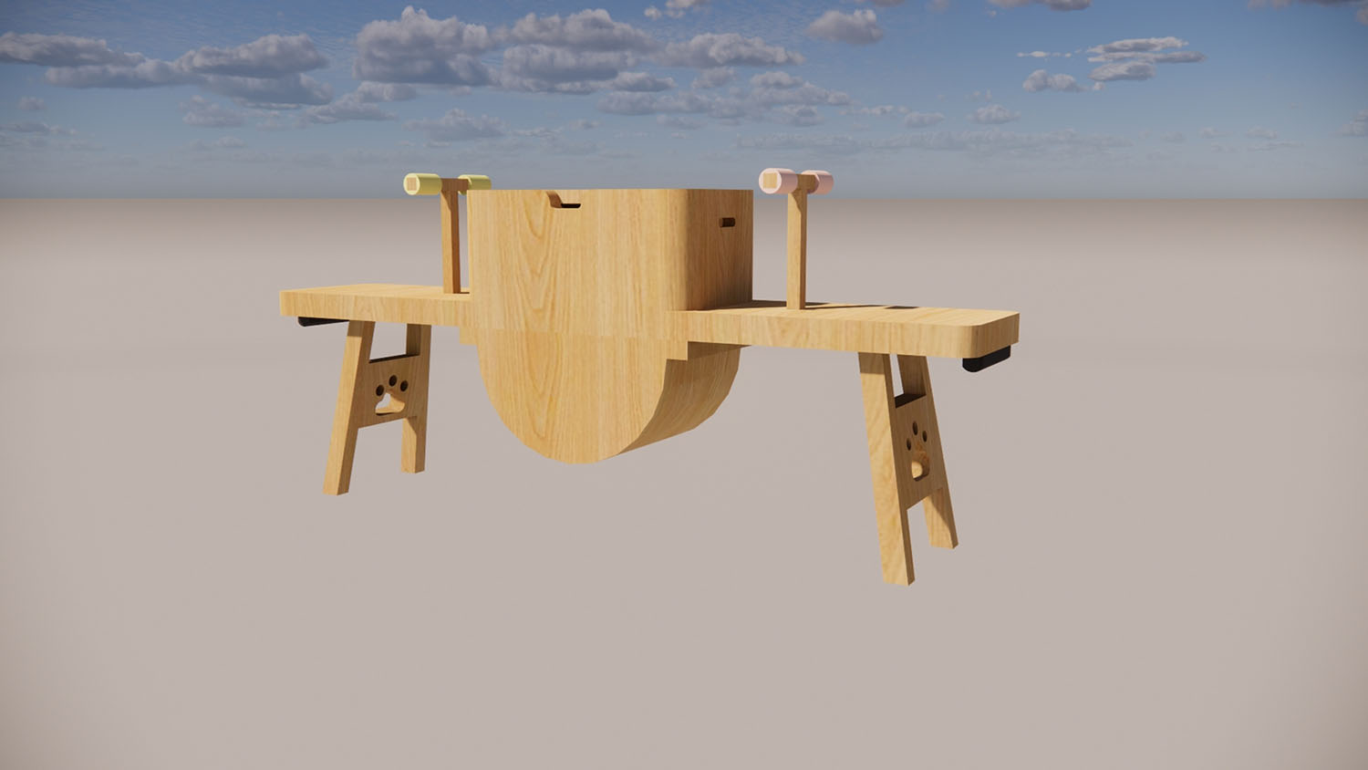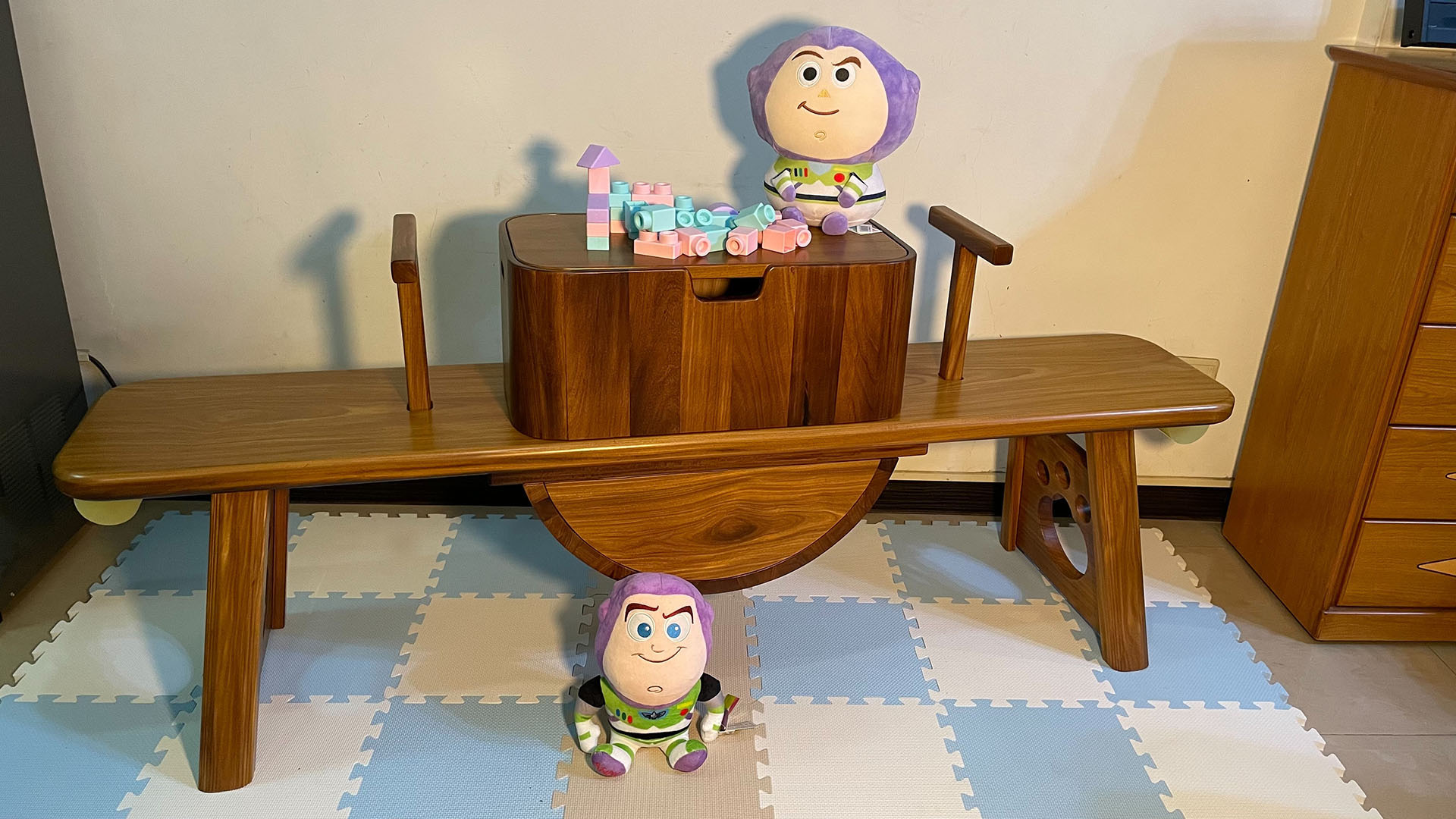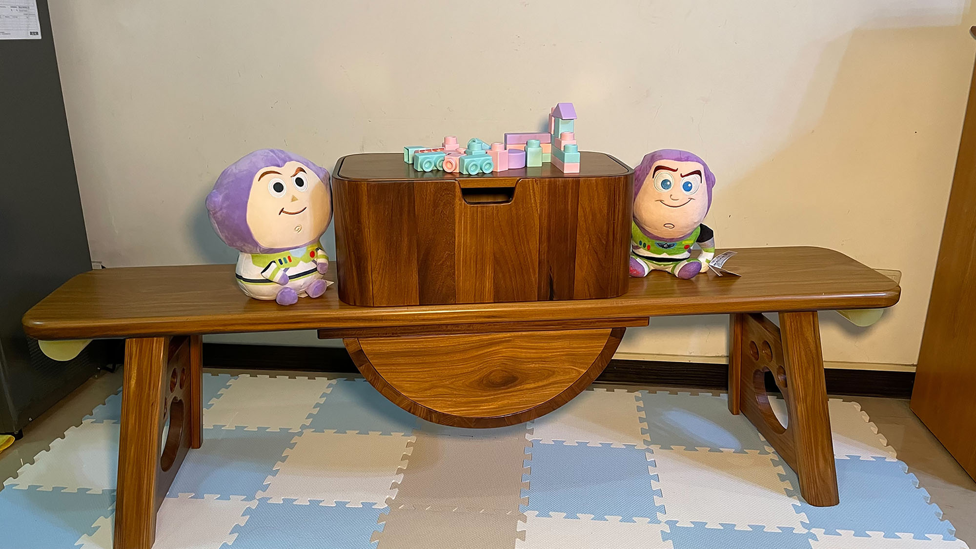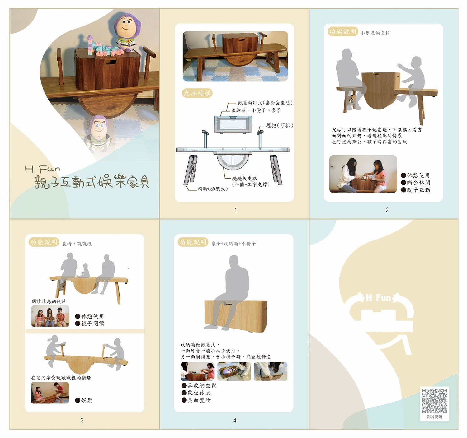 作品名稱為「H Fun親子互動式娛樂傢俱」,H Fun意指High Fun,想藉由產品達到高度娛樂性。因現代3C產品發達且父母忙於工作,手機取代了父母的陪伴,以致親子間的情感日漸疏遠,於是想製作一款增加親子互動的產品。作品以長板凳做為發想,由於其外型與蹺蹺板相似,便將兩者相互結合,為增加實用性,更融入多功能設計。