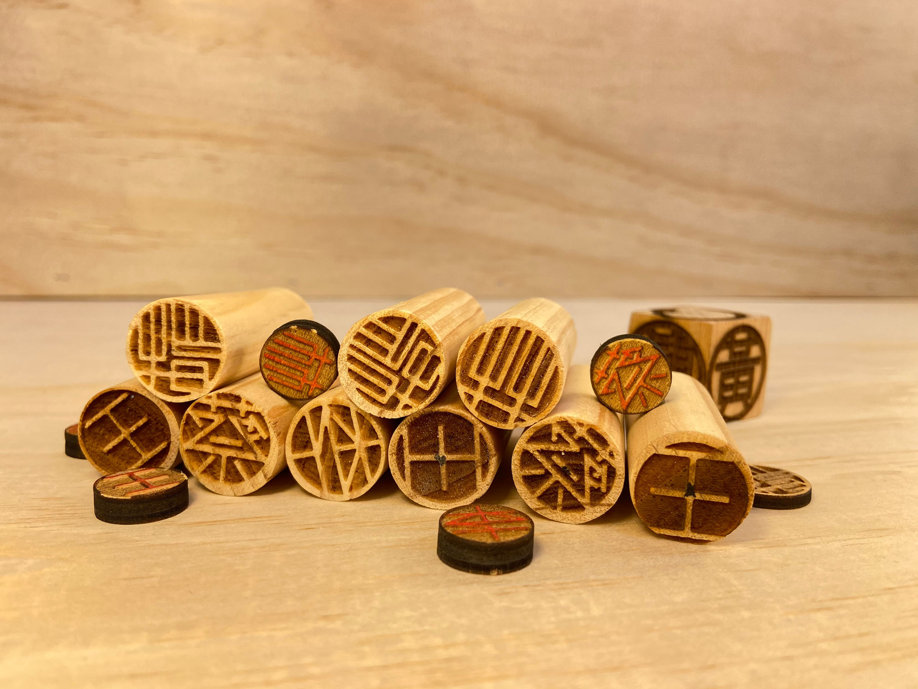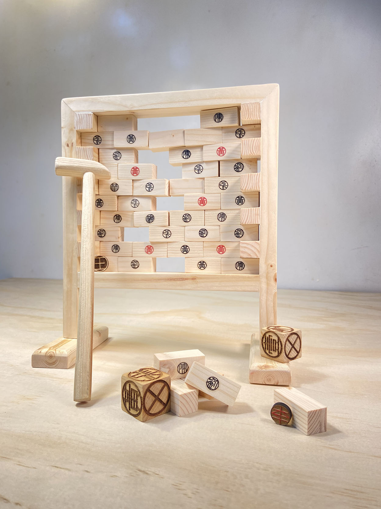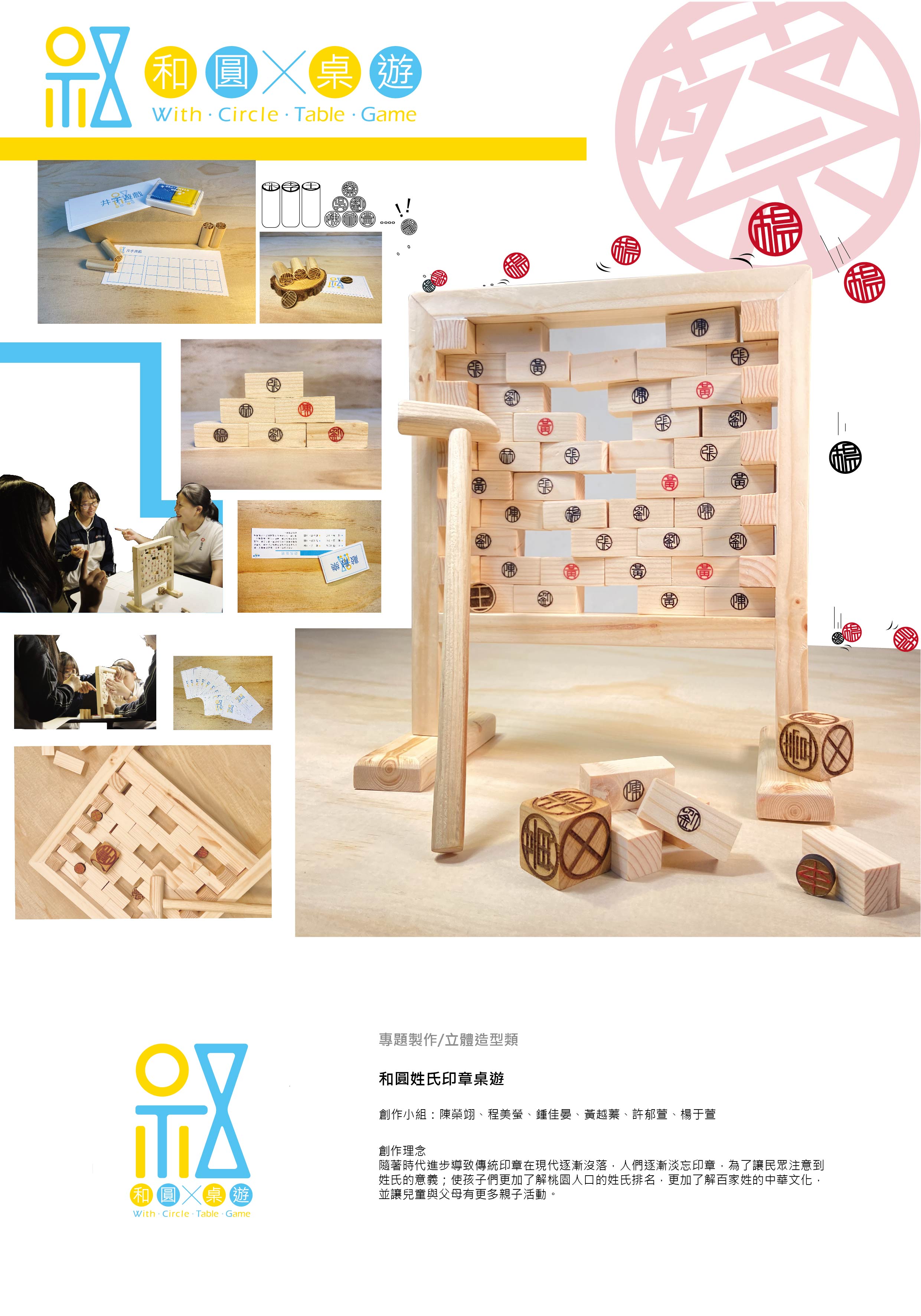 隨著時代的日新月異,導致傳統姓氏印章在現代社會中逐漸沒落、消逝,印章逐漸消失在大眾的眼中,為了讓民眾重新注意到印章,也為了使孩童們更加的了解「桃園」地區的前幾大姓氏,因此選擇了製作成桌遊的方式來進行互動式學習,使用了大眾耳熟能詳的井字遊戲以及敲敲樂來進行發想,簡單清楚的遊戲規則,能讓大小朋友都能夠沒有壓力的輕鬆的一同遊玩,且能夠更加的了解百家姓的傳統文化,並讓孩子們與父母之間能夠更加深親子之間的互動情感。並且利用安全環保的木製材質來進行製作,使大小朋友都能安心遊玩。